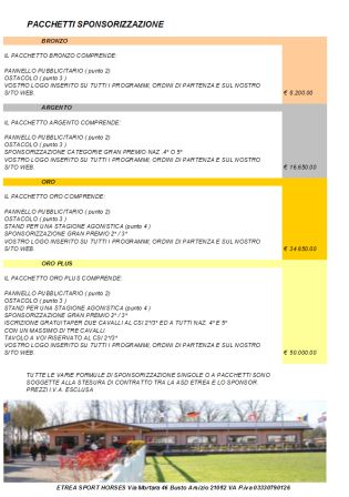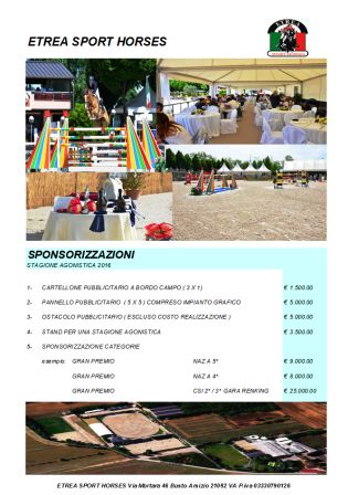 5m.x5m. o su striscioni di varie misure, sponsorizzare ostacoli da esporre durante i diversi eventi sportivi organizzati dall'Associazione Sportiva Etrea che, ogni volta, richiamano una gran quantita di pubblico italiano e straniero. Da quest'anno sara inoltre possibile intitolare categorie di gara nei numerosi concorsi ippici che si svolgeranno presso le nostre strutture.